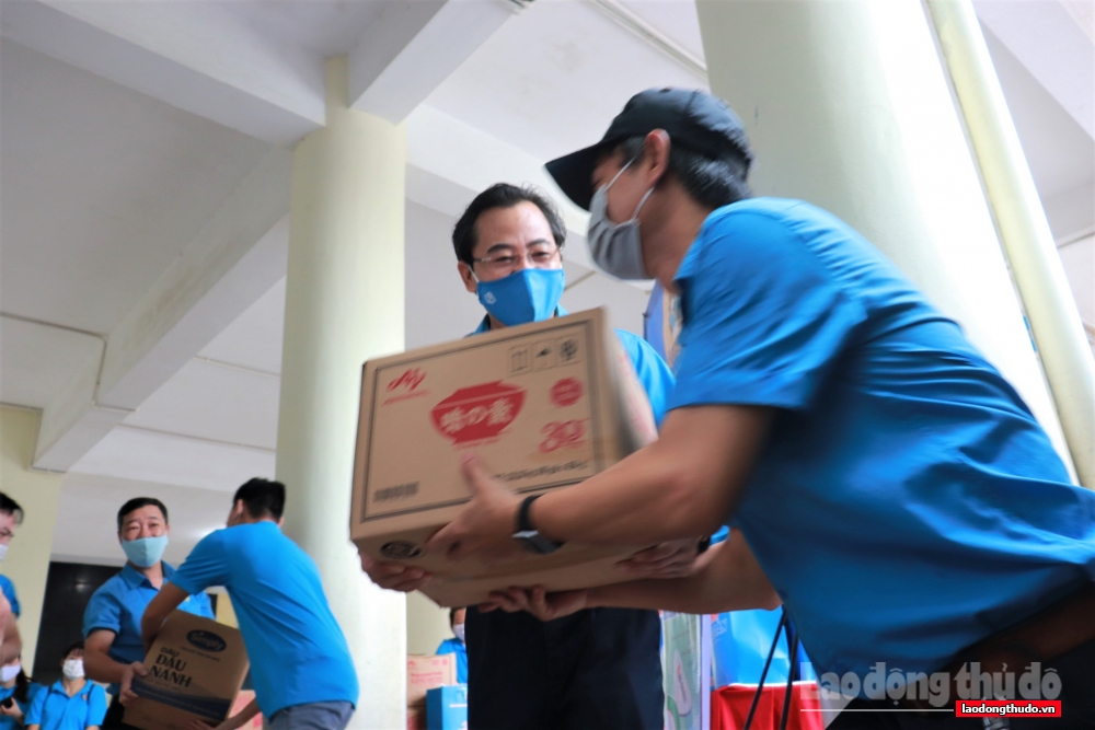 | Đoàn viên, người lao động quận Cầu Giấy tham gia bốc xếp hàng hóa, chia quà |