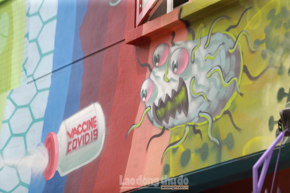 | Theo đó, nội dung các hình vẽ trên bức tường của căn biệt thự này nhằm tuyên truyền, cổ động phòng chống dịch Covid-19. |