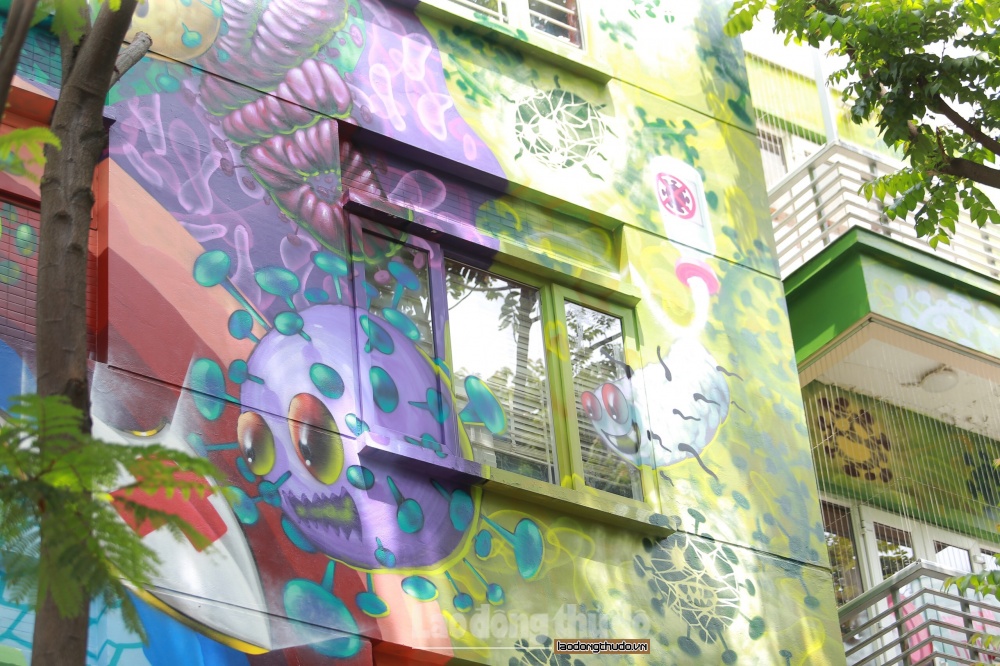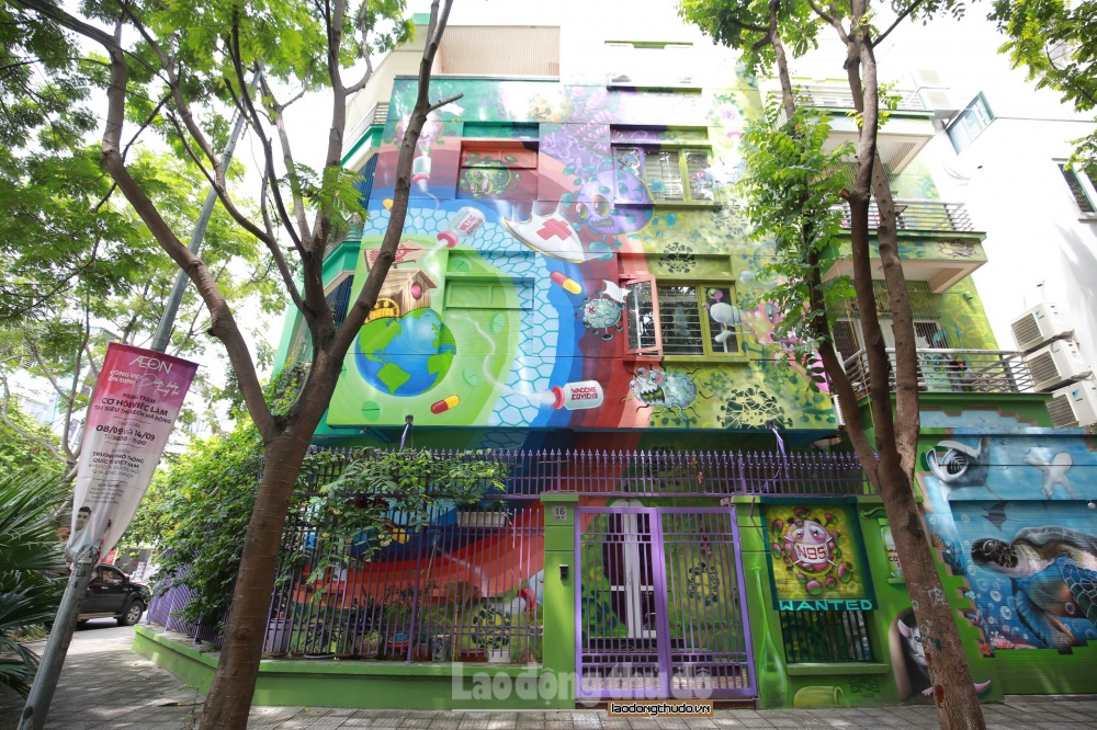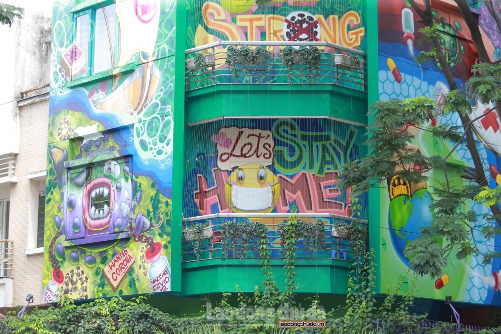 Với màu sắc và những hình vẽ độc đáo, căn biệt thự tại khu đô thị Văn Phú (quận Hà Đông, Hà Nội) thu hút sự chú ý đặc biệt của bất kì ai đi ngang qua đây bởi những thông điệp phòng chống dịch Covid-19.