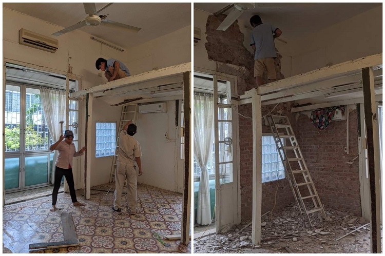 | Quá trình cải tạo bắt đầu với việc phá dỡ các hạng mục cũ nát và sửa chữa phần thô. Đường điện và nước được cho đi âm tường và sàn để tạo ra các mặt phẳng sạch sẽ. Làm lại sàn bằng vật liệu bê tông mài, sơn lại toàn bộ phòng, phân chia lại chiều cao của gác xép để đủ chỗ cho người đứng. Thay lại toàn bộ hệ thống cửa, giữ tối đa diện tích cửa để tận dụng ánh tự nhiên. |