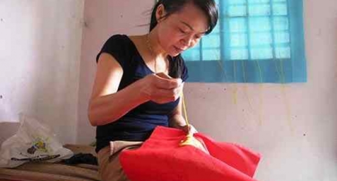 Chị Nguyễn Thị Tuyên đang thêu tranh làm quà Tết cho gia đình Ảnh: HỒNG NHUNG