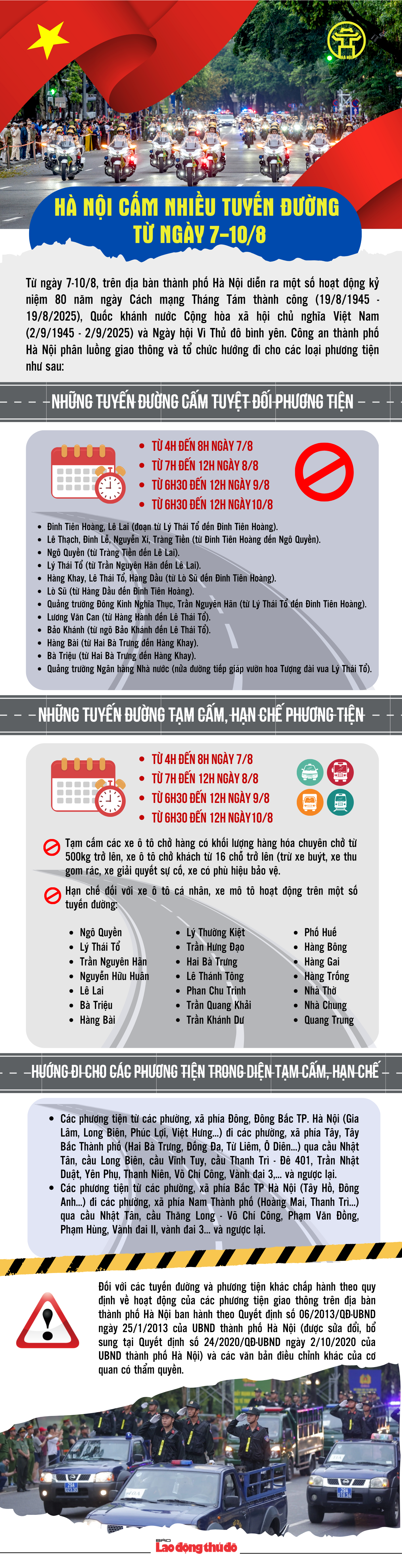 Trong các ngày 7 đến 10/8, Hà Nội cấm nhiều tuyến phố trung tâm để phục vụ sự kiện Ngày hội vì Thủ đô bình yên cũng như công tác chuẩn bị cho Lễ kỷ niệm 80 năm Cách mạng tháng Tám, Quốc khánh 2/9.