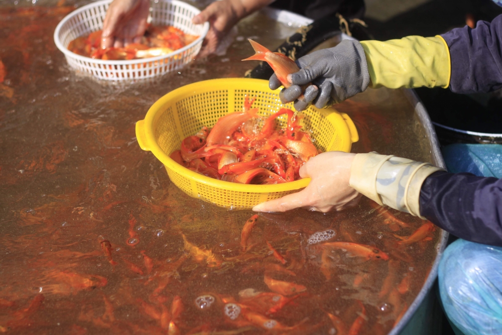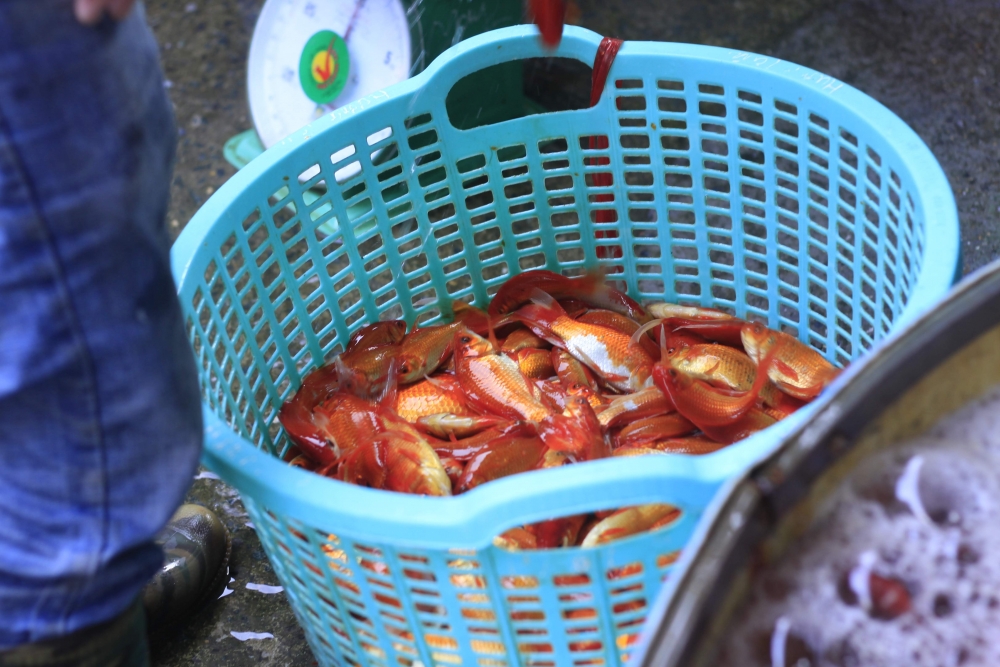| Tiểu thương đến mua cá chép đỏ tại chợ luôn chọn cá rất kỹ. |
