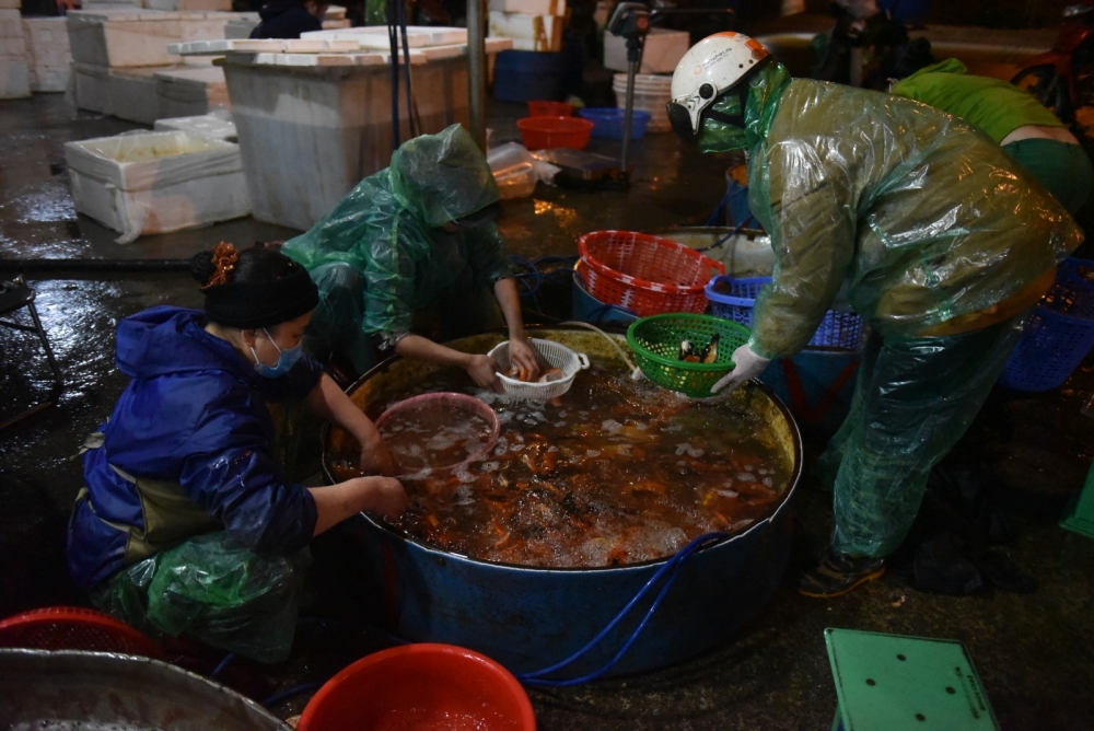 | Hàng chục tiểu thương đến chợ cá Yên Sở mua cá để bán cho người dân cúng ngày ông Công ông Táo. |
