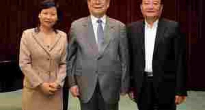 | Ông Giang Trạch Dân chụp ảnh lưu niệm với lãnh đạo Đại học Hải dương Thượng Hải (Ảnh: china.org.cn) |