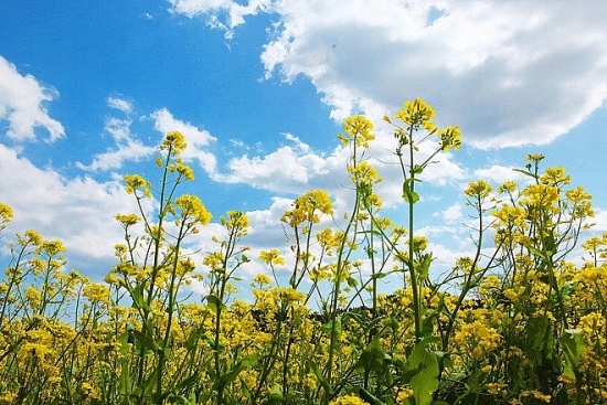 Thời điểm này, Hà Giang đã rực rỡ bởi những vạt hoa cải đang vào mùa, nhưng đâu đó vẫn có sắc trắng điểm trên cành lê, hay thấp thoáng những cây đào nở muộn, nổi bật trên cái nền xanh thẫm của vùng cao nguyên.