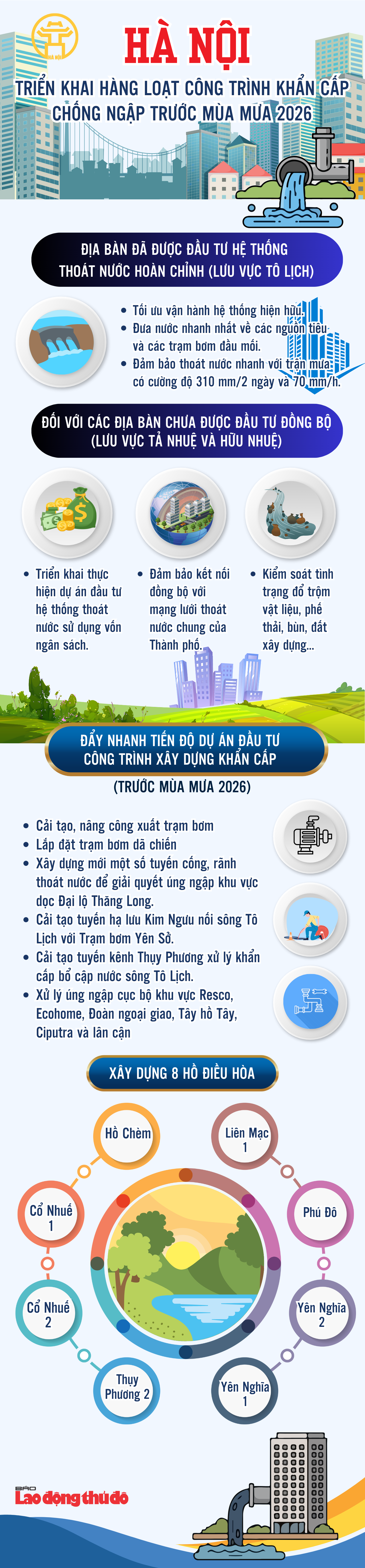 Hà Nội vừa ban hành Kế hoạch số 325/KH-UBND về khắc phục tình trạng úng ngập trên địa bàn Thành phố. Theo đó, xây dựng 8 hồ điều hòa gần 150ha và nâng cấp hệ thống thoát nước, từ cải tạo cống, kênh đến tăng cường thiết bị bơm để ứng phó với tình hình úng ngập trong mùa mưa năm 2026.