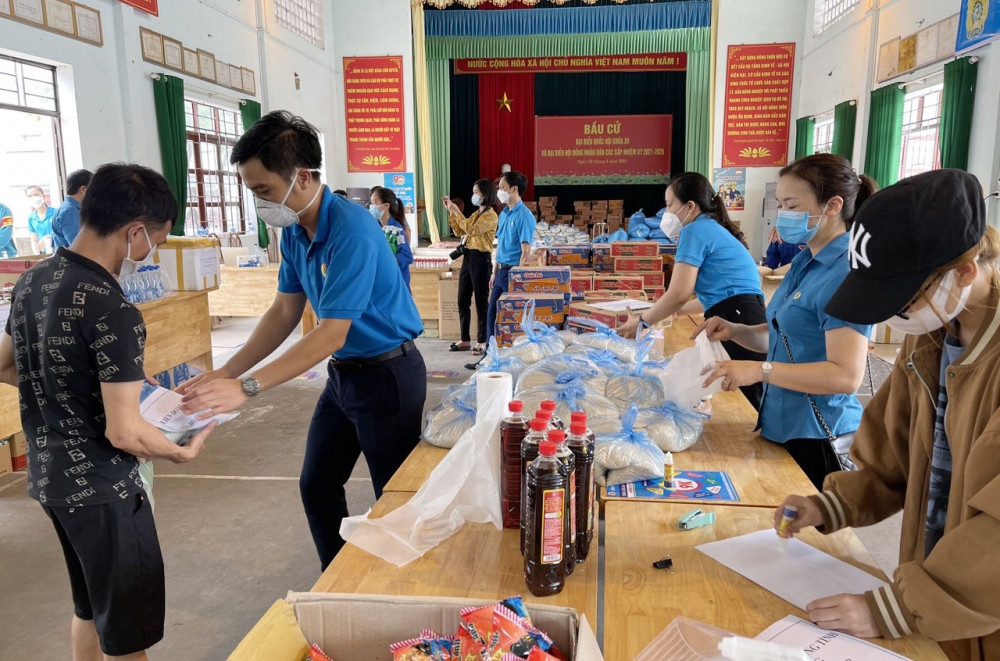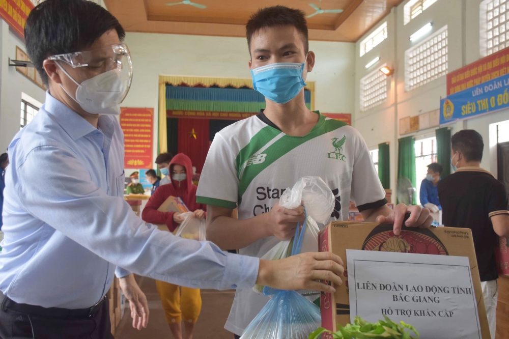| Phó Chủ tịch Tổng Liên đoàn Lao động Việt Nam Ngọ Duy Hiểu trao hàng Liên đoàn Lao động tỉnh Bắc Giang hỗ trợ tới công nhân lao động đang thực hiện cách ly |