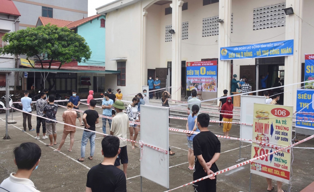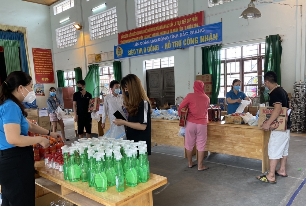 Không để đoàn viên, người lao động trong các khu vực cách ly bị thiếu đói, Liên đoàn Lao động tỉnh Bắc Giang đã chủ động phối hợp với chính quyền địa phương mở các điểm “Siêu thị 0 đồng” phục vụ miễn phí, nhằm đáp ứng nhu cầu thiết yếu liên quan đến đời sống cho công nhân lao động đang bị cách ly.