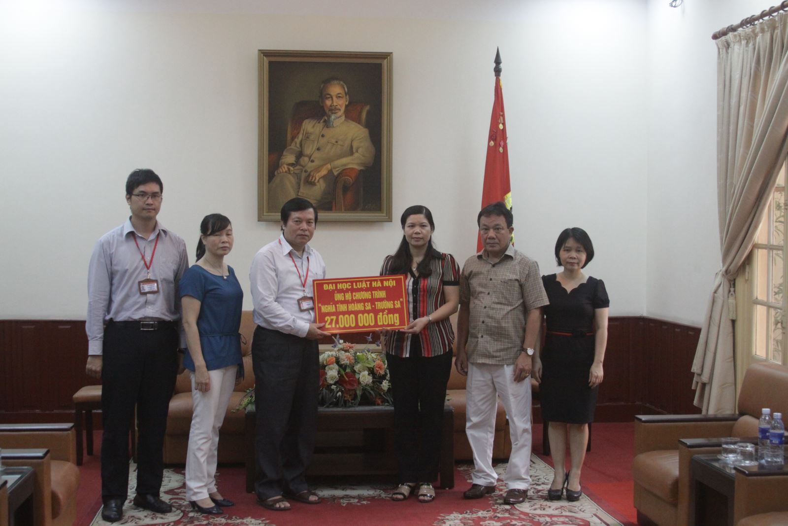 Thay mặt tổ chức Công đoàn Thủ đô và chương trình “Nghĩa tình Hoàng Sa – Trường Sa”, Phó chủ tịch LĐLĐ TP Hà Nội Đặng Thị Phương Hoa tiếp nhận số tiền của Đại diện Trường ĐH Luật ủng hộ chương trình và trân trọng cảm ơn tấm lòng của cán bộ, giáo viên, sinh viên nhà trường;