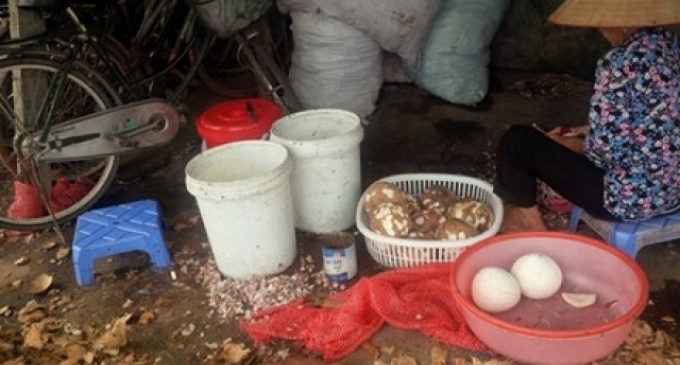 Tại xưởng kem Sáu-Thủy ở thôn Cựu Lục (xã Văn Phúc) nằm sát ngay đường liên xã lúc nào cũng bụi mù mịt là 2 người phụ nữ đang cắm cúi chế biến nguyên liệu thô cho những chiếc kem dừa sắp ra lò. Nguyên liệu ở đây chính là những trái dừa được lột vỏ chỉ còn trơ cùi được vứt lăn lóc dưới đất, ruồi bu đen đặc.