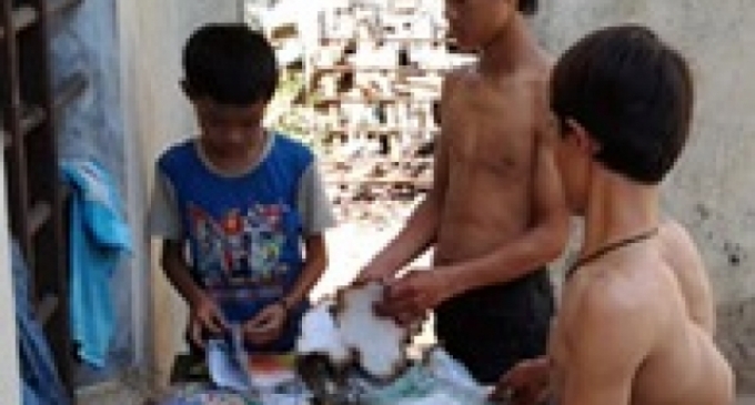3 anh em dị tật ham học thẩn thờ trước đống sách vở vị cháy, không còn sử dụng được. Con đường đến trường của các em đã mịt mù hơn bao giờ hết.