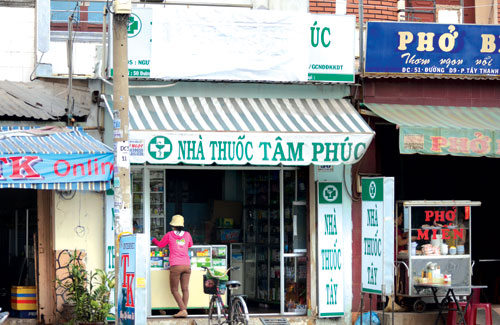 Tại Q.Tân Phú, chúng tôi tìm đến các nhà thuốc Gia Khiêm, nhà thuốc Tâm Phúc, nhà thuốc Mỹ Trang, nhà thuốc Kiều Trinh. Cả bốn nhà thuốc này đều nằm trên địa bàn P.Tây Thạnh. Tại nhà thuốc Tâm Phúc, nhiều bệnh nhân đến mua thuốc, nhưng ở đây lại không có dược sĩ đại học tư vấn hay đứng bán, và ngay cả bảng hiệu cũng không có số chứng nhận hoạt động. Nhà thuốc bán từ thuốc tây, đông dược, thực phẩm chức năng lẫn mỹ phẩm. Ở lĩnh vực thuốc tây có cả thuốc không kê đơn lẫn thuốc có kê đơn như: Ciprofloxacin, Erybact, Fatig, Calcium, Obimin, vitamin B1, Cefixim... Tình trạng này cũng tương tự tại nhà thuốc Gia Khiêm, Mỹ Trang.