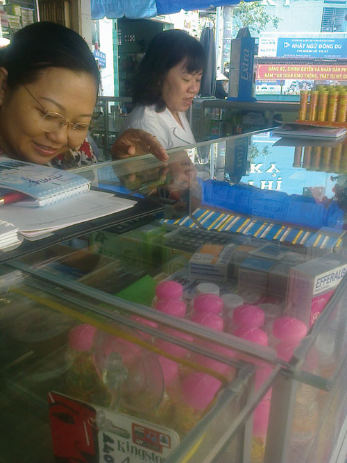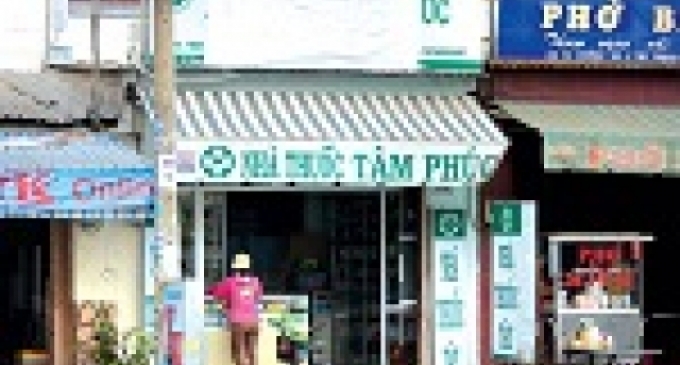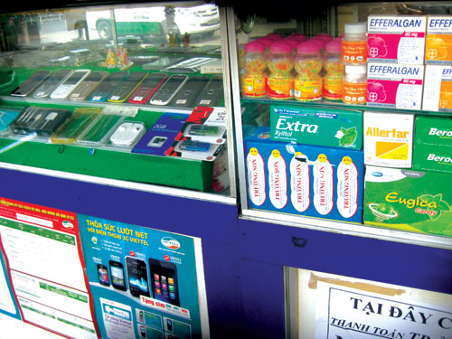 Cụ thể, các nhà thuốc Hải Liễu (Q.10), Gia Khiêm, Tâm Phúc, Mỹ Trang, Kiều Trinh (Q.Tân Phú)..., nhìn bên ngoài đều như những tiệm tạp hóa. Tại nhà thuốc Hải Liễu, sát bên các tủ thuốc là những tủ kính bán sim, card điện thoại cũng mang tên Hải Liễu. Bảng hiệu “nhà thuốc Hải Liễu”, không hề có số chứng nhận cấp phép hoạt động lẫn tên của dược sĩ.