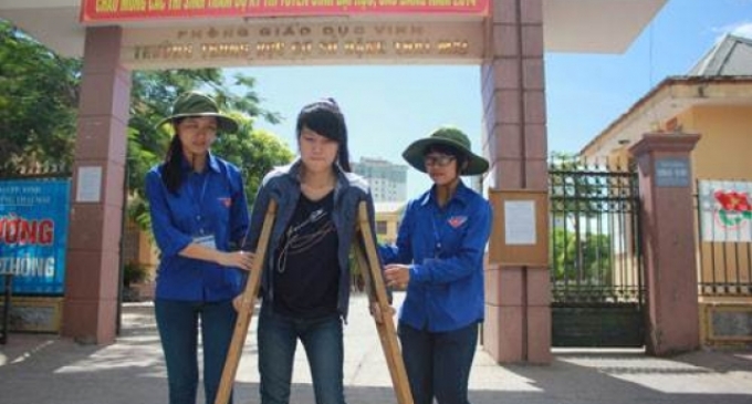 | Nguyễn Thị Phúc được sinh viên tình nguyện điểm thi THCS Đặng Thai Mai, phường Hưng Phúc (Vinh) hỗ trợ nhiệt tình. Ảnh: Nguyễn Hải. |