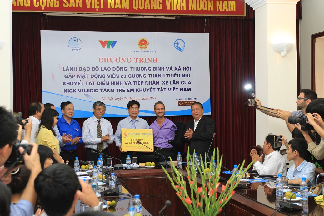 Cuối buổi giao lưu, Nick đã trao tặng 50 xe lăn địa hình cho đại diện Quỹ bảo trợ trẻ em Việt Nam để giúp đỡ những em bé khuyết tật và những chiếc máy tính bảng cho 23 gương người khuyết tật.