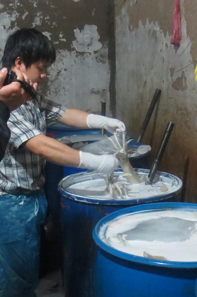 Cách đây chưa đầy một tuần, đội cảnh sát môi trường Ba Đình, Hà Nội đã bất ngờ kiểm tra khu vực buôn bán thủy sản trong chợ Long Biên. Tại kho G2, cơ quan chức năng bắt quả tang Vũ Mạnh Cầm (22 tuổi, ở Ân Thi, Hưng Yên - nhân viên khu thủy sản), đang đổ hàng chục kg mực ôi, bốc mùi vào các thùng phuy cỡ lớn chứa hóa chất công nghiệp. Theo lời khai ban đầu của Vũ Mạnh Cầm, Cầm chỉ làm thuê cho bà chủ Ngô Thị Nụ (46 tuổi, ở phường Bạch Đằng, quận Hai Bà Trưng, Hà Nội). Để làm trắng sản phẩm, Cầm khai phải hòa 300ml oxy già công nghiệp vào thùng phuy nước, trước khi đổ mực kém chất lượng vào ngâm. Sau 30 phút, anh ta dùng gậy sắt đảo đều tới khi mực trắng, hết mùi thối thì đem ra bán.