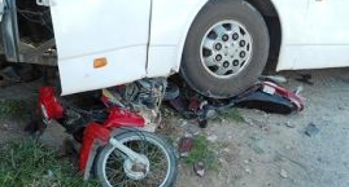 Tại hiện trường, ba chiếc xe máy bị chiếc ô tô khách cán nát bét nằm dưới gầm ô tô, một chiếc bánh bị rơi ra khỏi xe khách, phần đầu chiếc xe khách cũng bị hư hỏng nặng.
