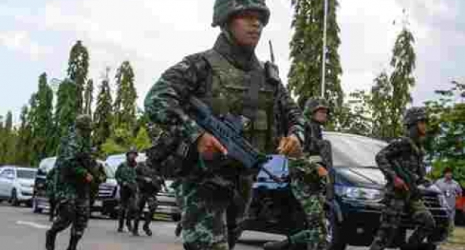 | Quân đội Thái Lan trang bị vũ khí hiện diện khắp nơi trên đường phố Bangkok |