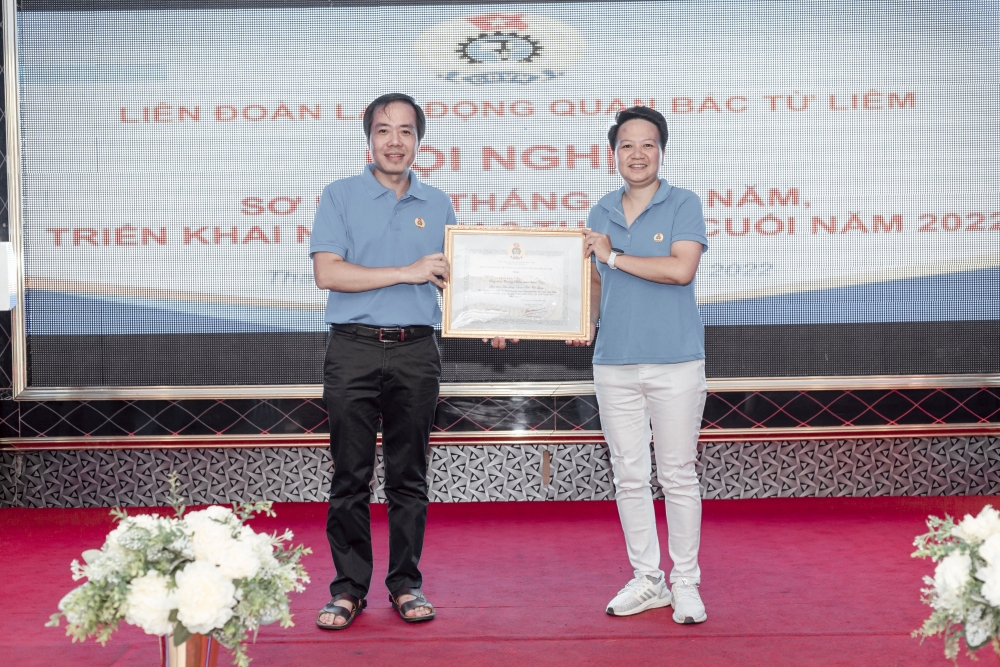 | Phó Chủ tịch Thường trực Liên đoàn Lao động thành phố Hà Nội Đặng Thị Phương Hoa trao Giấy khen cho các "Công nhân giỏi" quận Ba Đình năm 2021. |