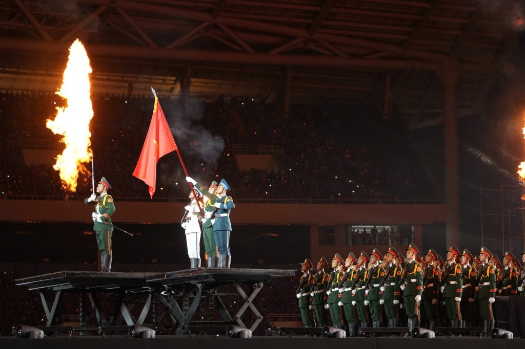 Ngay từ phút mở đầu, màn hòa giọng bài "Tiến quân ca" của 80 nghệ sĩ, quân nhân và hơn 50.000 khán giả tại Sân vận động Quốc gia Mỹ Đình đã khiến khúc ca Tổ quốc bay vút lên với khí thế ngút ngàn, tinh thần Việt Nam đoàn kết, thống nhất, thắm đượm tình yêu quê hương đất nước.