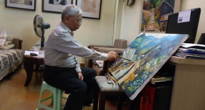 4. Ngôi nhà 3 tầng của vợ chồng hoạ sỹ Tô Ngọc Thành nằm khuất trong ngõ nhỏ phố Tây Sơn (Hà Nội). Ngôi nhà chật ních tranh mà ấm cúng, hai con trai ông cũng học hội hoạ nhưng không theo nghề vẽ, hiện đã ở riêng, chỉ còn hai vợ chồng già chăm nhau. Bà Ngọc bảo, hễ chỗ nào còn trống trong nhà là ông ấy lại nhét tranh vào, ba gian nhà không còn chỗ nào trống, ngay tại gian tiếp khách cũng bị tranh chiếm hết chỗ, khách vào phải cẩn thận kẻo dẫm phải tranh. Không biết 10 năm nữa thì 1.000 bức tranh mà ông dự định vẽ ra sẽ để ở đâu. Ông Thành nói vui: “Hoạ sỹ phải luộm thuộm thì mới vẽ tranh đẹp được”. Vợ ông cười vui, cố tình “bóc mẽ” chồng với tôi: “Ông này chỉ được cái khéo mồm, hoạ sỹ như ông thuộc diện luộm thuộm thì có”.