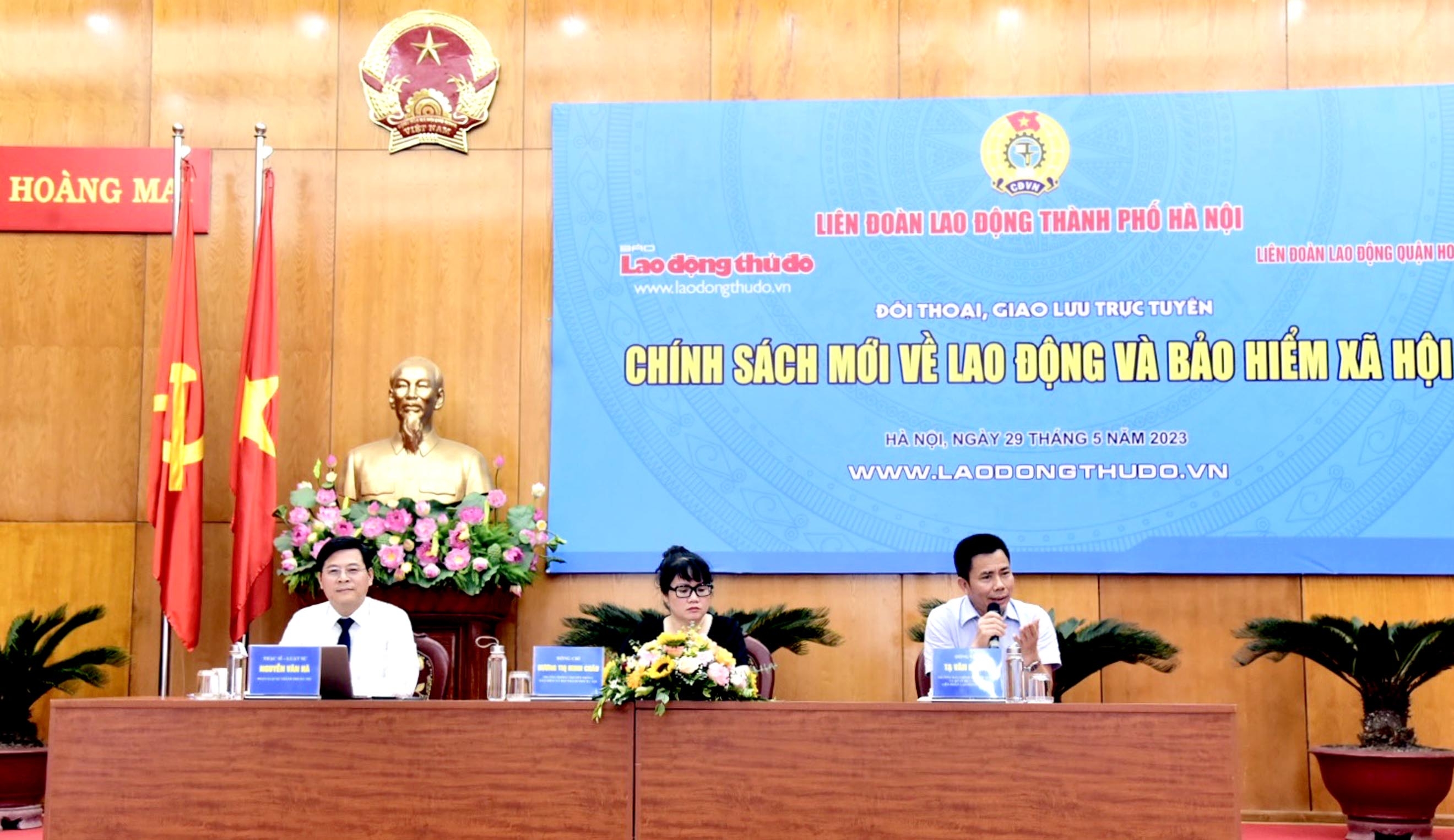 Đến dự buổi Đối thoại, giao lưu trực tuyến có các đại biểu: Ông Nguyễn Huy Khánh - Phó Chủ tịch Liên đoàn Lao động (LĐLĐ) thành phố Hà Nội; ông Kiều Thanh Hùng - Phó Chủ tịch Thường trực Hội nhà báo Hà Nội; ông Nguyễn Bá Châu - Ủy viên Ban Thường vụ, Chánh Văn phòng LĐLĐ Thành phố; ông Lê Xuân Trường - Ủy viên Ban Thường vụ, Trưởng Ban Tổ chức LĐLĐ Thành phố; ông Tạ Văn Dưỡng - Ủy viên Ban Thường vụ, Trưởng Ban Chính sách pháp luật và quan hệ lao động.