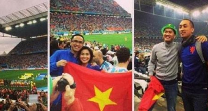 Vợ chồng Tăng Thanh Hà giơ cao cờ Việt Nam ở World Cup