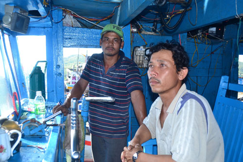 (Chú thích ảnh: Ngư dân Nguyễn Ngọc Quý và thuyền trưởng Si (người ngồi) chưa hết bàng hoàng kể lại việc bị tàu Trung Quốc tấn công, lấy tàu cá, bắt giữ bạn chài)